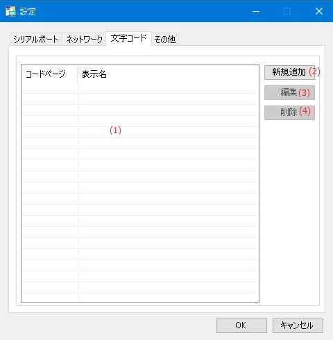 | (2) | [新規追加]ボタン | 文字コードリストに新しいコードページを追加します。 |